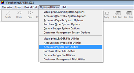 1. Select {Options/Utilities}, then select {Accounts Payable File Utilities}.
