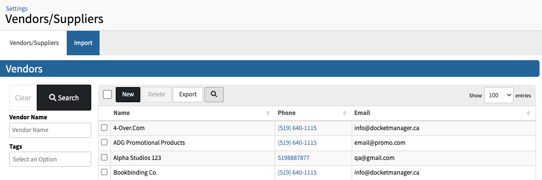 1. Select {Settings} and then select {Vendors/Suppliers} under Dockets.