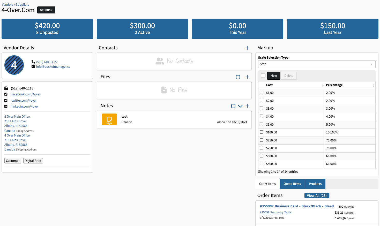 Vendors in the system are for outsourced purchases and work. Default mark up tables can be set for each vendor to calculate by default when the vendor is added to an order.