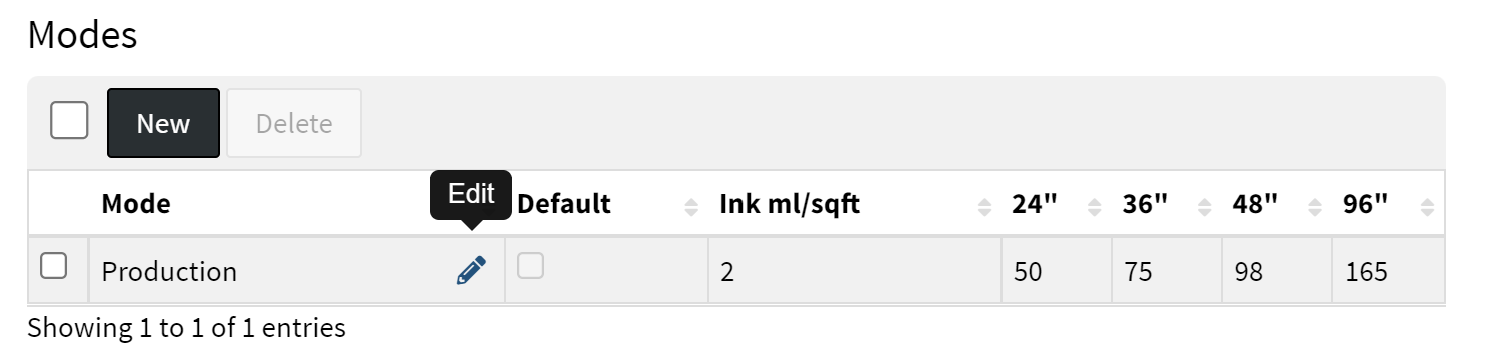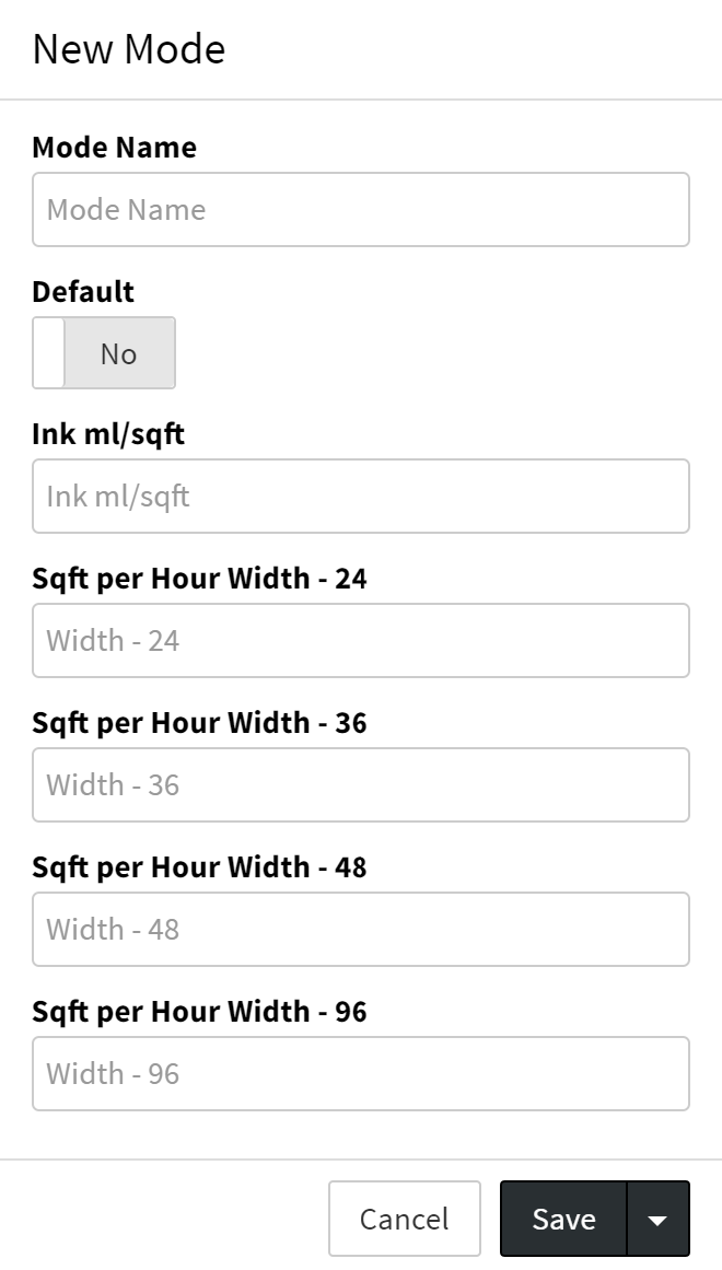 | Ink ml/sqft or sqm | Enter value for milliliters of ink charge per square foot/meter for the mode. |