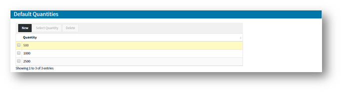 Default Quantities allow users to quote multiple common quantities in one action. These quantities will appear in the pricing table of an item. One quantity can be selected and this will be the default quantity for the item when added to an order.
