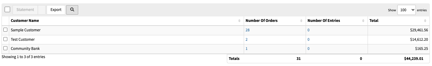 This shows a breakdown of Accounts Receivable Information by customer. The Totals on the bottom right-hand side show the total number of orders for all customers as well as the overall total accounts receivable. To export Accounts Receivable information, see Exporting Accounts Receivables.