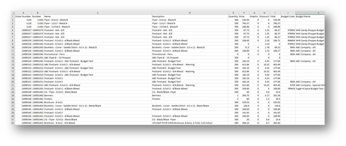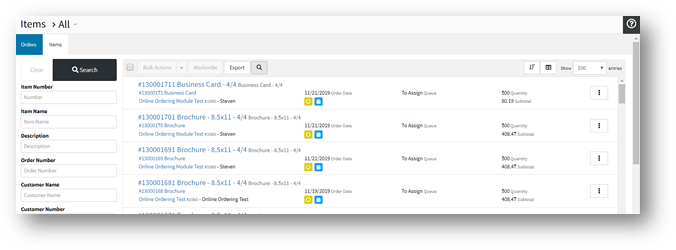 | Order Number Number Name Description Quantity Price Graphic Discount Total Budget Code Budget Name Unit of Measure Sets Versions Sheets Pages Template Group Template Name Template Option Customer Customer Number Contact | Contact Phone Order Status Order PO Number Item Type Item Status Queue Goods Location Order Date Graphics Date Press Date Finishing Date Shipping Date Due Date Order Receiver Order Sales Rep Order Csr Graphic Artist Assign To Press Press Time Ink Colors Side 1 | Ink Colors Side 2 Stock Sheet for Cost Inventory Status Department Items Finishing Time Tags Graphic Notes Press Notes Finishing Notes Outsourced Notes Shipping Notes Generic Notes Proof Notes Commission Contacts Paid Commission Amount Commission Amount Vendors Vendor PO |