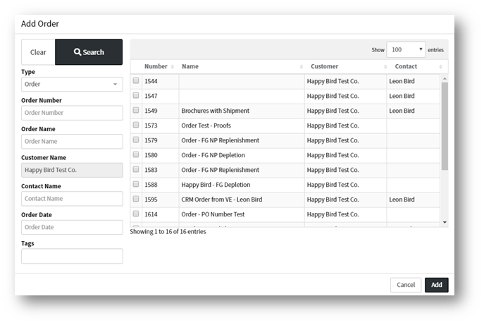 Note: The Add Order results will be filtered by Customer Name automatically as that field