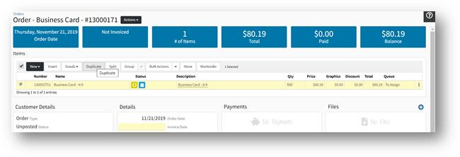 - Details from the original item will be copied identically into your new item including: commissions, tags, overrides, etc. These will not update even if the customer is changed on the order/quote/product.