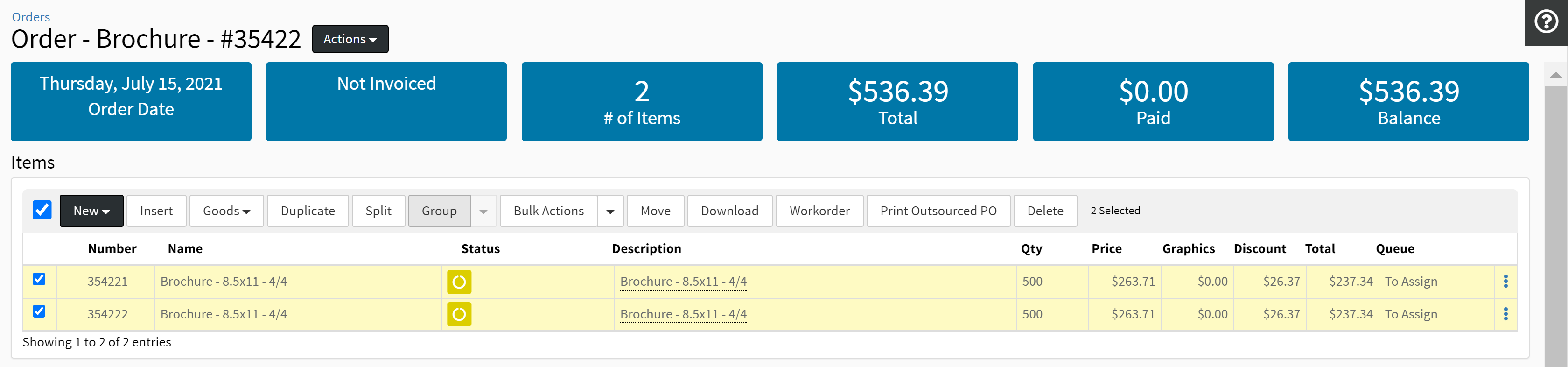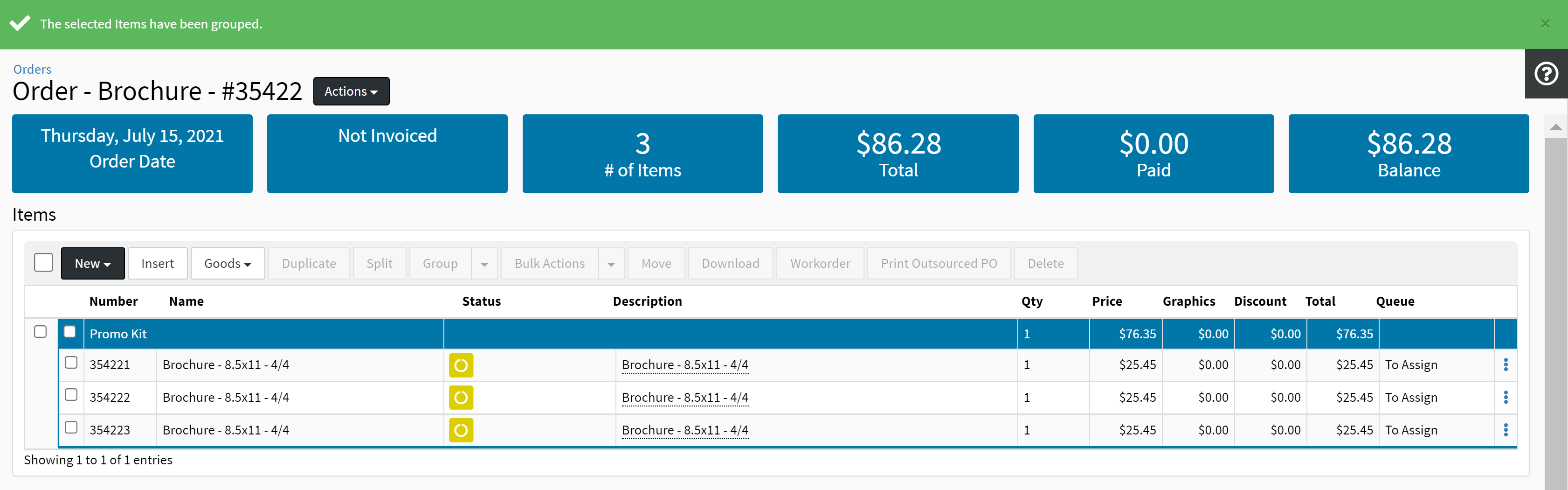 Note: When an item is added to an existing group, the item's quantity will not change to the group's primary quantity. Group edit or bulk actions can be used to update grouped items to be the same quantity.