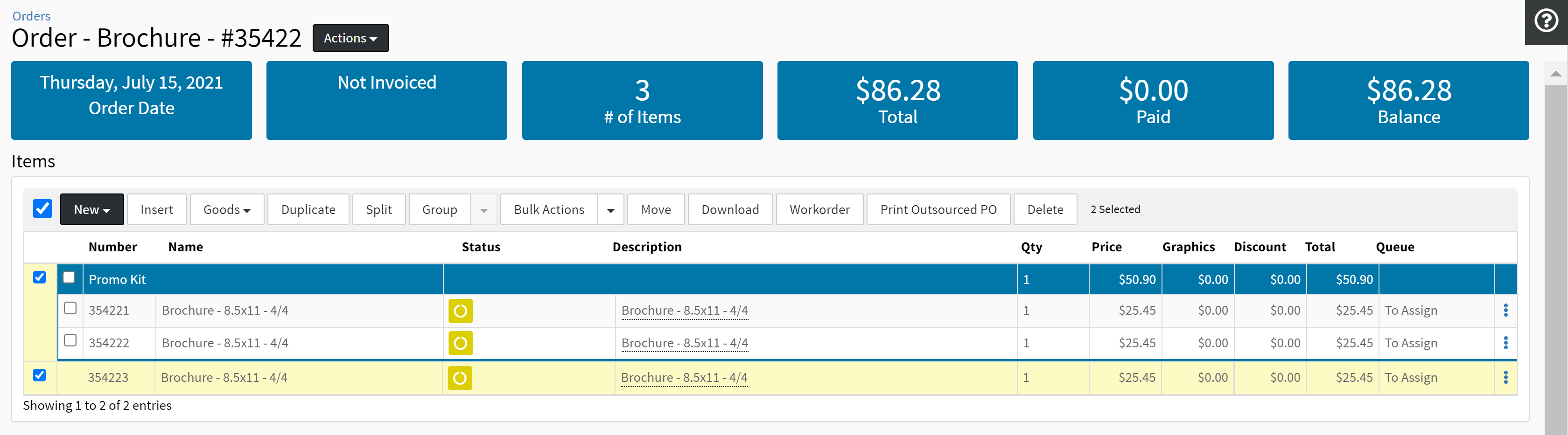 1. From the Order/Quote view page, select items to be ungrouped by checking