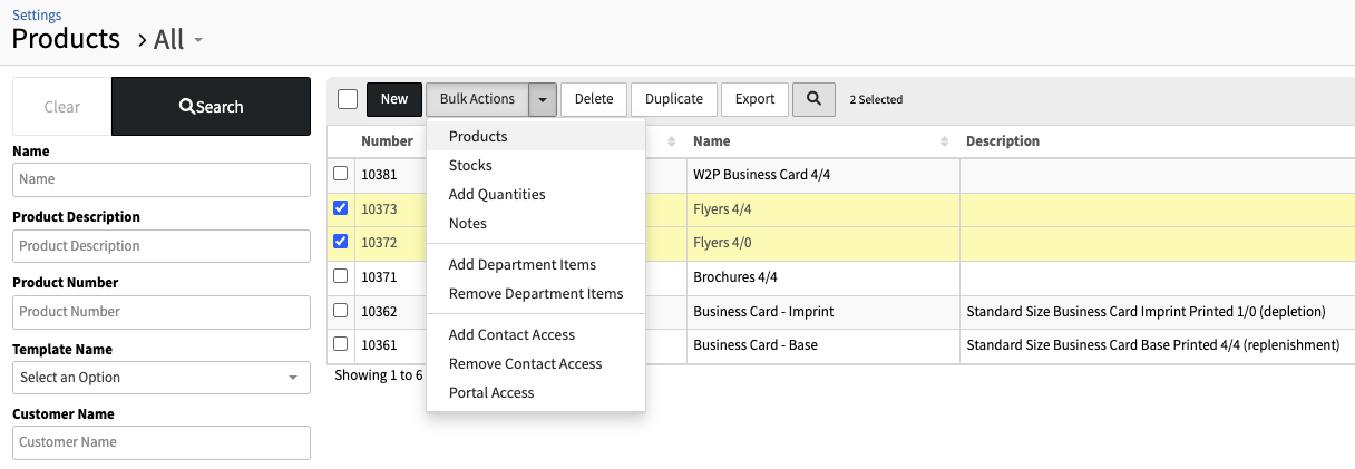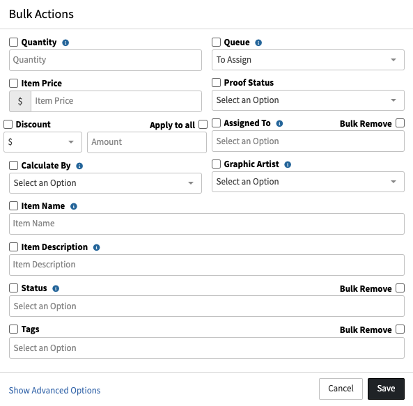 Bulk Actions are a selection of fields that can be used to quickly update information on one or more items without having to edit them individually. The system will determine if a recalculation needs to be done based on the Bulk Actions tool being used and the fields that are being updated.