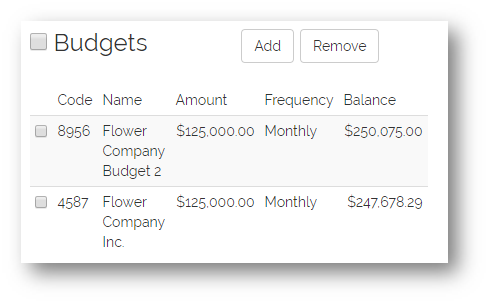 This will list all the budgets for this user. If there are no budgets visible or available to be added, the contact and/or company has not been setup for budgets.