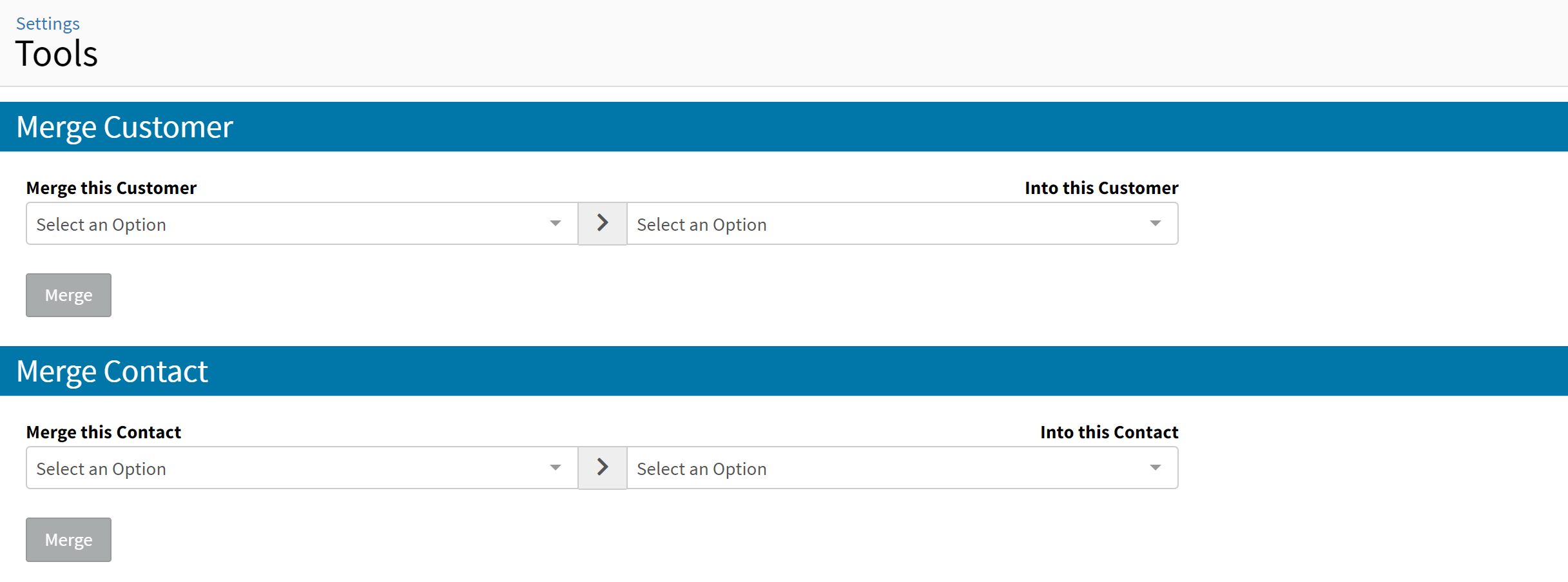 1. Select {Settings} and then select {Tools} under the Admin section. The Merge Customer/Merge Contact page will open.