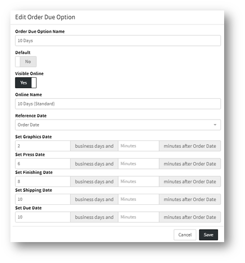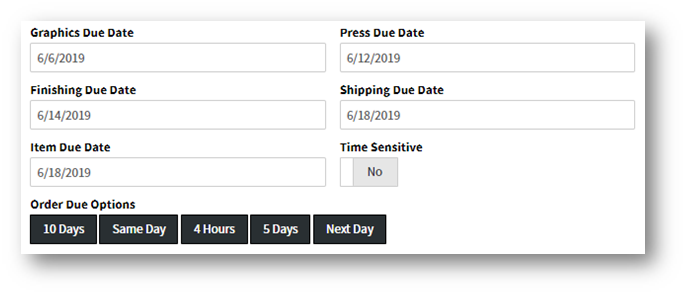 Order Due Options are a quick way to set due dates on items. By default they set the due date for each department that would be required in order to meet the overall deadline. These dates are just a default and can be changed at order item level for a specific job.