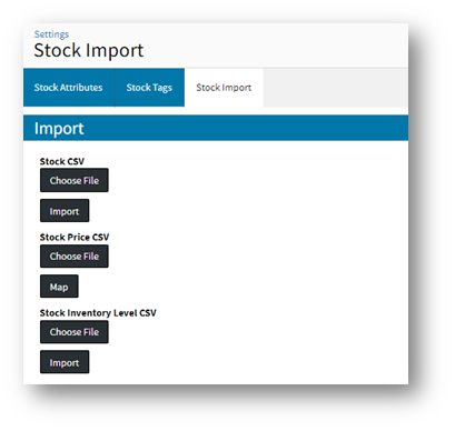 | Stock Inventory Level CSV | This option should be chosen when updating on-hand inventory levels. Note: Stock Inventory Level CSV Import will only update On-Hand column so this option cannot be used to update any other stock information. |