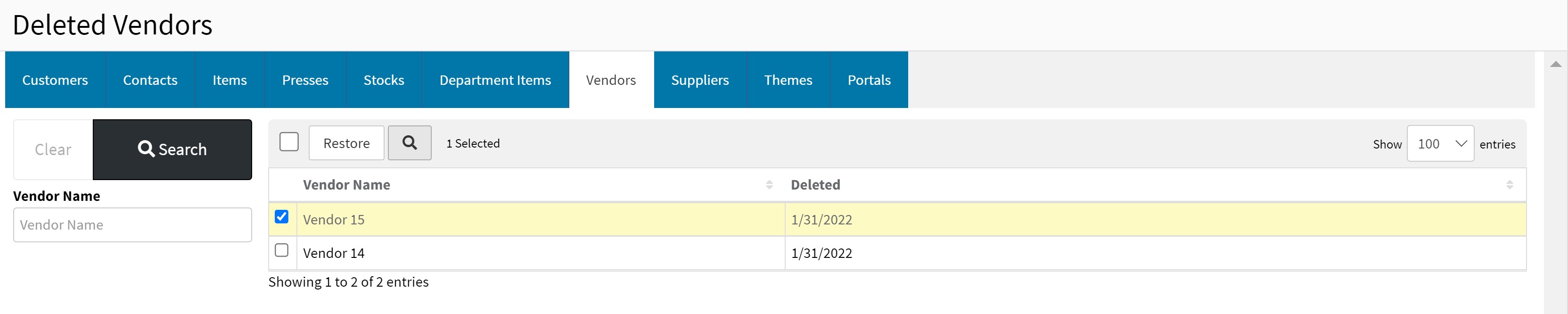 1. Go to Settings > Admin section > Deleted and select the Vendors tab.
