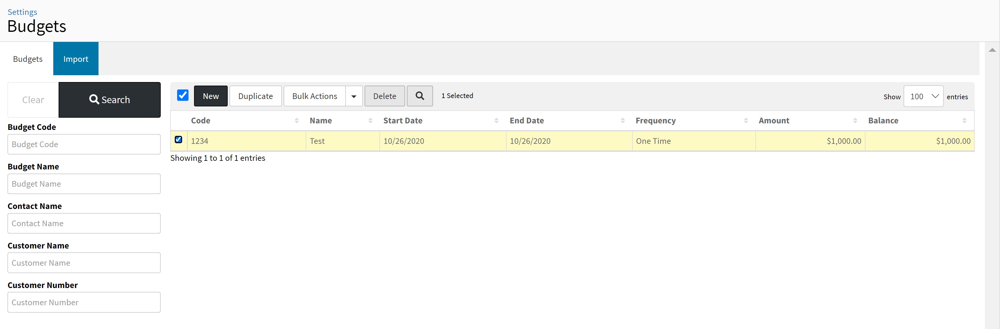 1. Select {Settings} and then select {Budgets} under the Customers section.