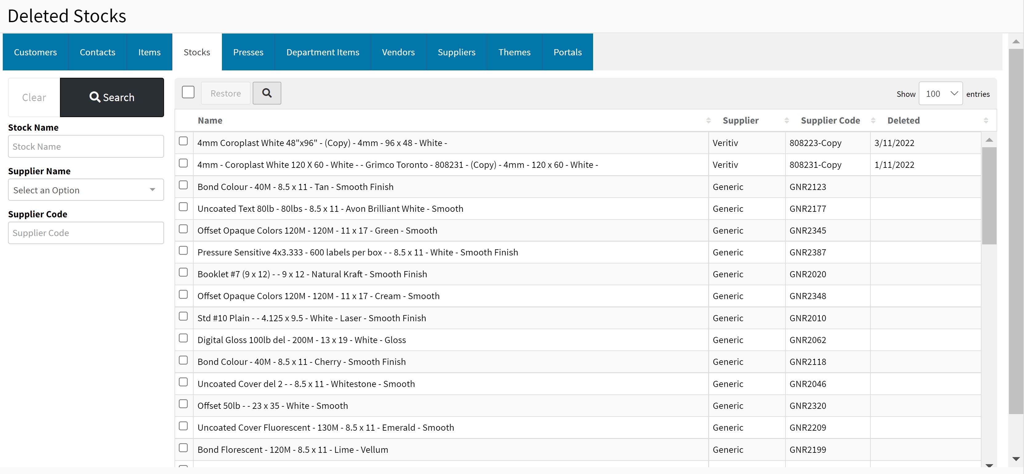 1. Go to Settings > Admin section > Deleted and select the Stocks tab.