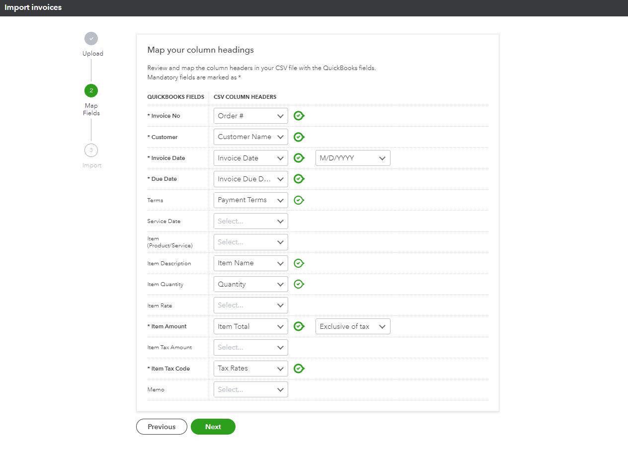 | ItemTaxCode | This must be filled out on all orders, it is helpful to match rates already in QBO but you can map it on the import. To customize the rate to match QBO, go to Settings > Accounting > Financial > Tax Rates. |