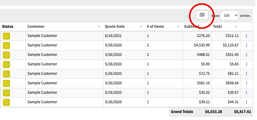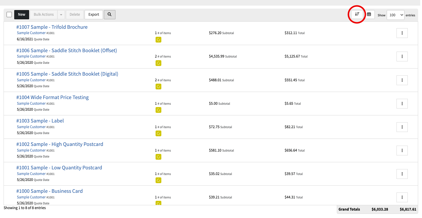 To sort the data contained in the order table in Card View click the sort icon shown below.