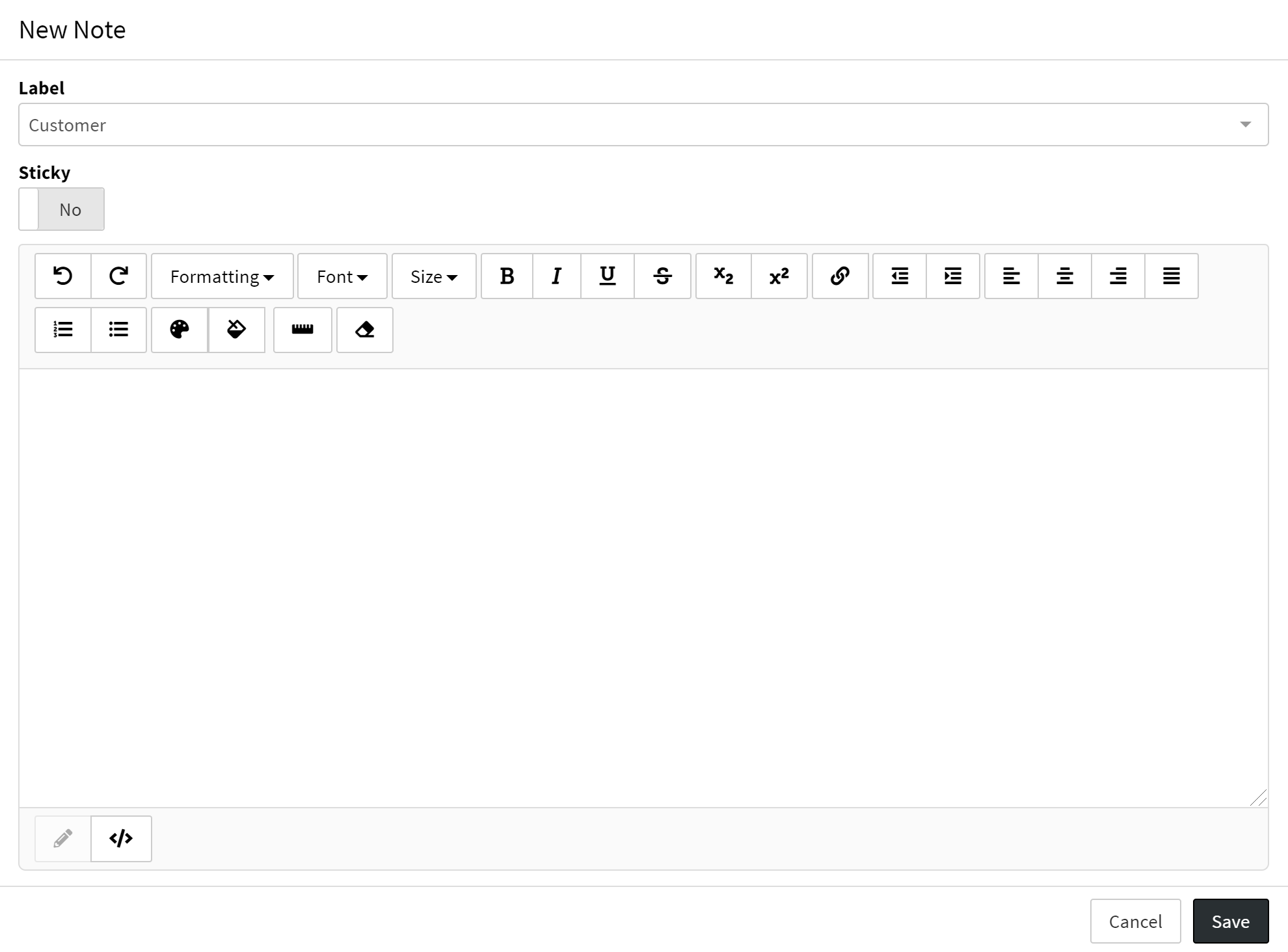 | Sticky (Option not available on all notes) | Default set to No. If toggle switched to Yes, drop-down will become visible to add a Type. |