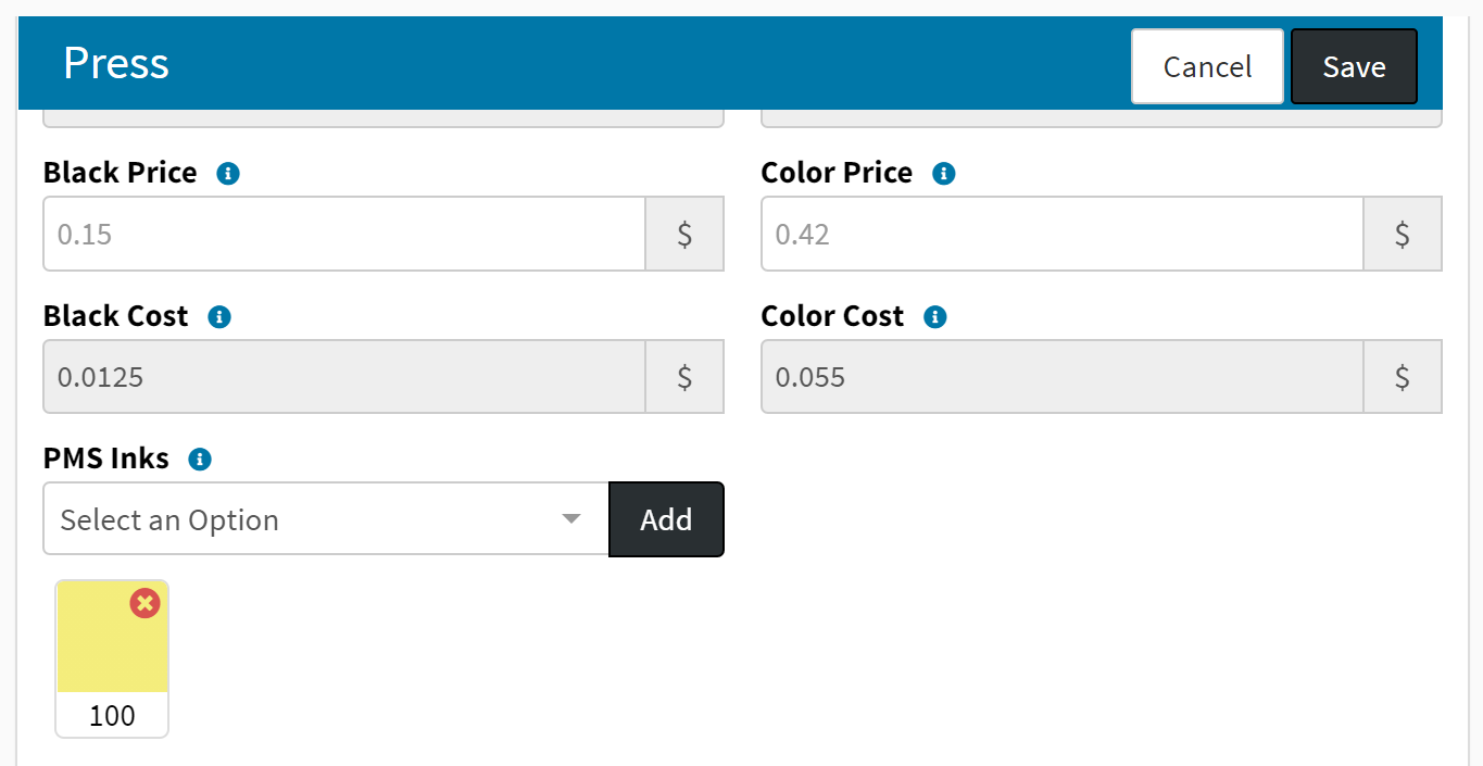 | Passes - Enter value for number of passes. Inks - Enter value for number of inks. Plates - Enter value for number of plates. Plate Price - Enter value for plate price. Setup Minutes - Enter value for setup time. Impressions Per Hour - Enter value for impression per hour. Aqueous Coating - Select Yes or No from the drop-down. PMS Inks - Select a PMS Ink from the drop-down menu then select {Add}. A window will pop-up to confirm PMS Ink successfully saved.