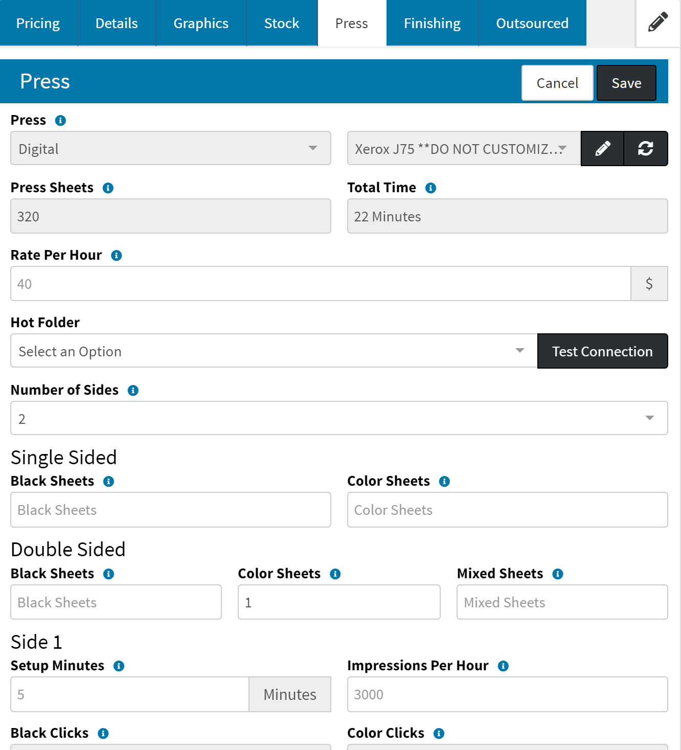 - If Hot Folders have been enabled on the press, the Hot Folder field will be visible. An option can be selected from the drop-down or a path can be directly entered in the text field.