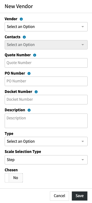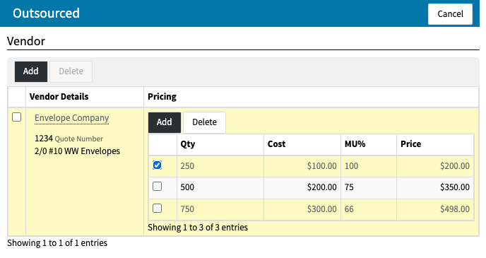 Mark the Vendor as Chosen. Multiple vendors can be added to a quote / order but only the vendor that is marked as Chosen will be used for pricing. This allows you to store multiple vendor quotes on a quote / order in case the initial chosen vendor cannot produce the work in the time allotted once the order is ready to be produced. Yep, no more searching through emails or file cabinets for vendor quotes when the vendor you rely on can't come through for you.