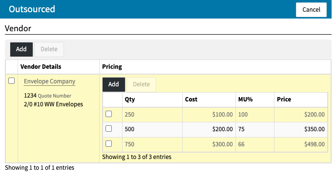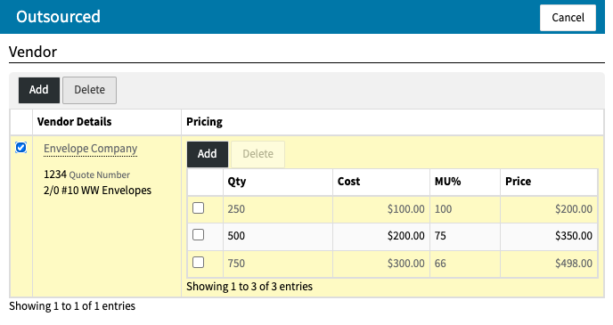 The Outsourcing tab allows you to chose a Vendor and apply their pricing to a quote or order with a markup.