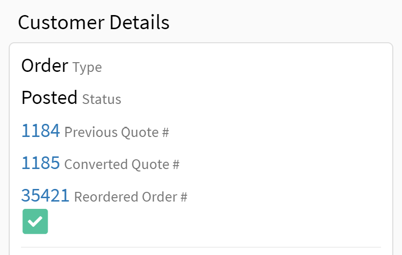 A pop-up will confirm the order has been successfully reordered or the order has been successfully converted. The page will redirect to the new Order or Quote view page. The previous order number will appear under the Customer Details section for the new order/quote.