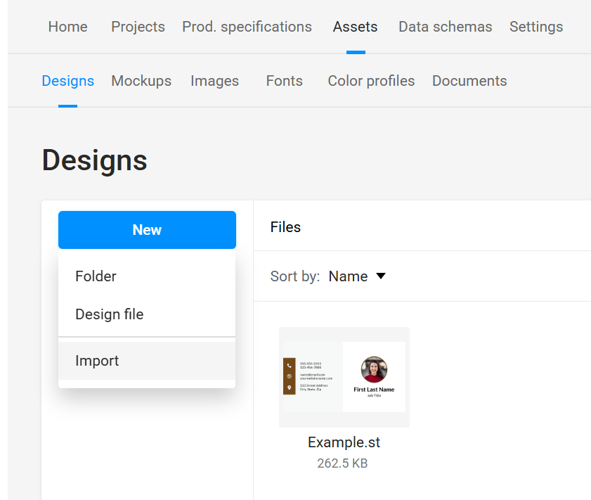 Import InDesign (.idml) or Photoshop (.psd) designs, or start from scratch in Customer's Canvas with a New Design File.